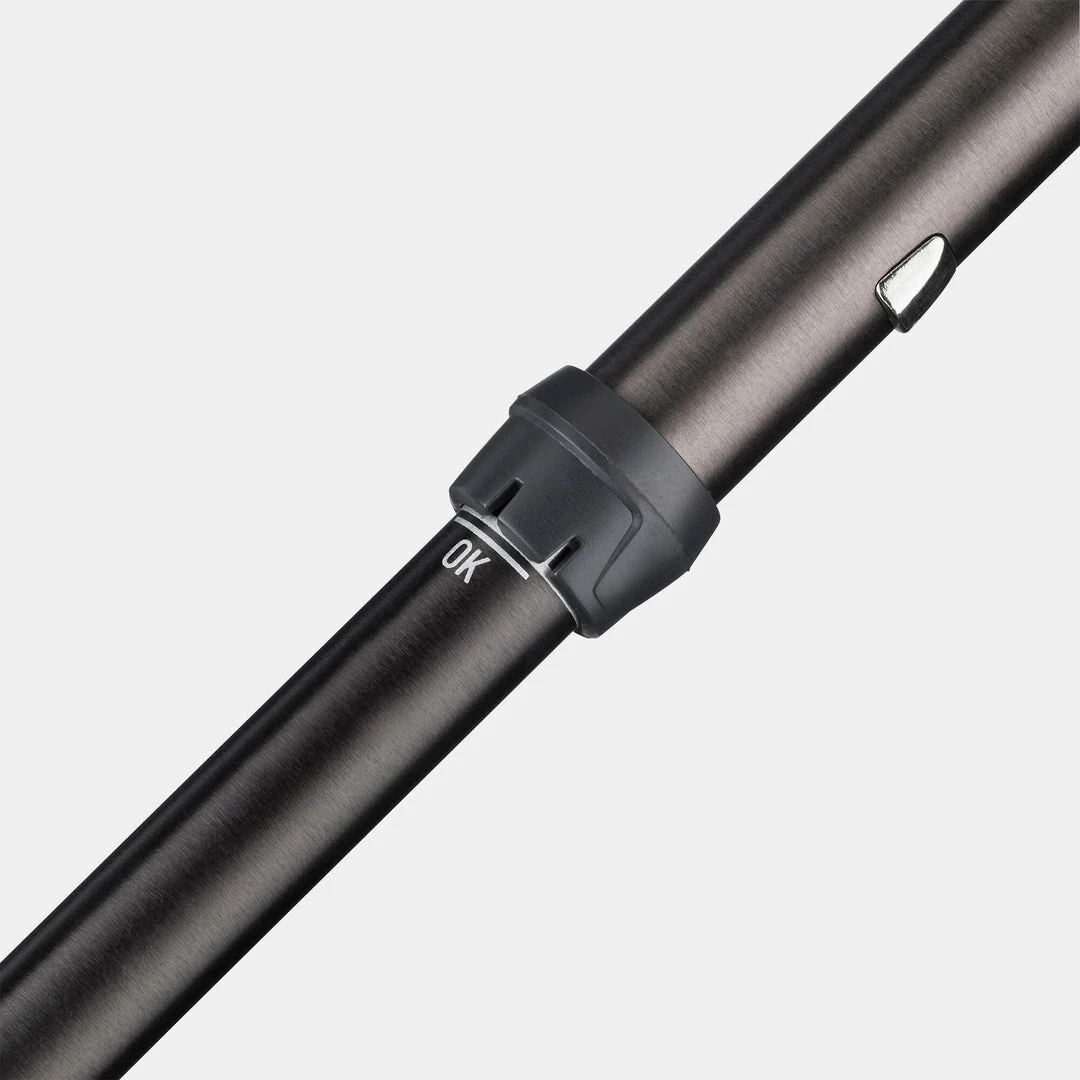 To adjust the length: open the outer lever, slide the tube to the desired length, and close the lever. Pull the lower part until the automatic push-pin locks.