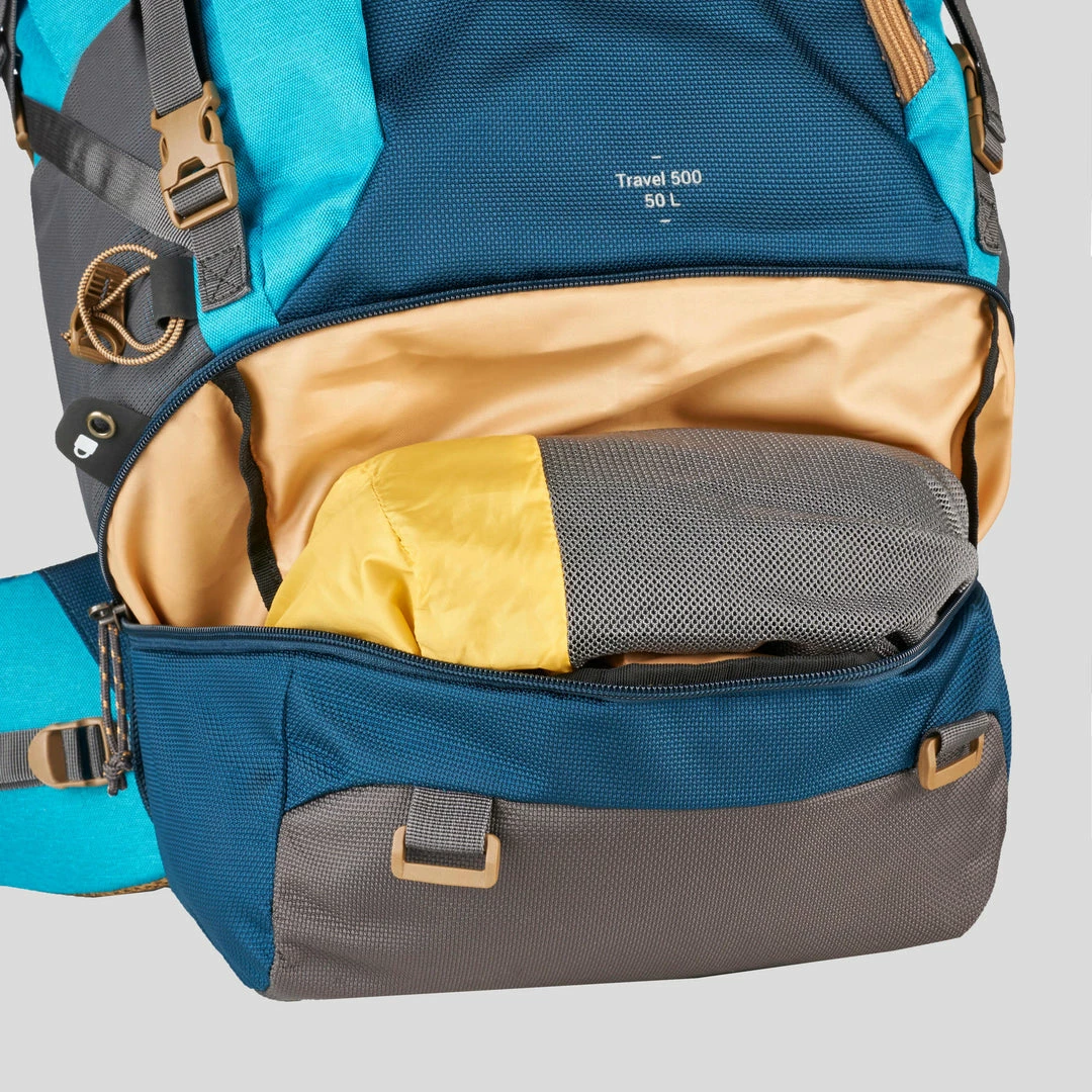 Put your bedding at the bottom. Near your back, place heavy equipment (tent, stove, food). Pack your clothes around these items. The groundsheet can be placed under the flap; the tent under the bag if there’s no space inside. Keep a waterproof jacket and fleece to hand. In the pockets, place small items for the day (sunscreen, map, glasses…). The water bladder can be placed in the compartment generally provided down the back.