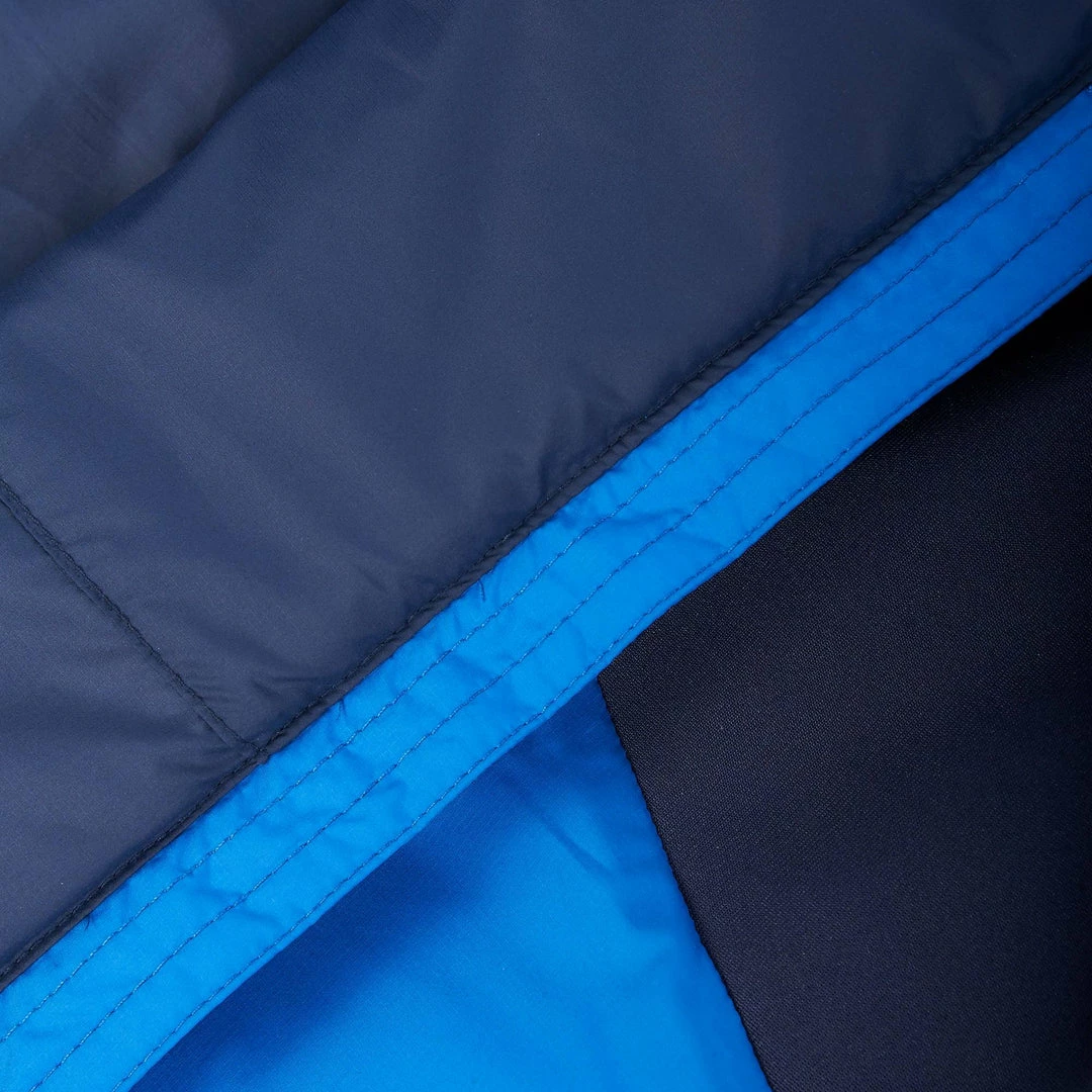 The material of this down jacket is water repellent. It allows drops of water to slide off the fabric which delays the penetration of water into the quilted jacket while you get out of the rain. The shoulders and hood of the jacket, which are more exposed to the rain, are waterproof. We nevertheless recommend wearing a waterproof jacket over the quilted jacket in the event of prolonged exposure to the rain.