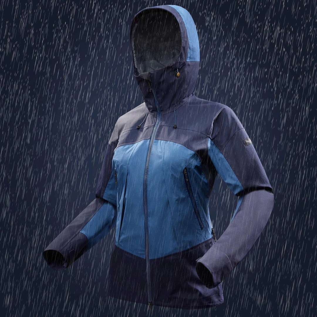 Waterproof jacket using the combination of a lightweight, breathable fabric and a sturdy fabric to help protect you from the elements.