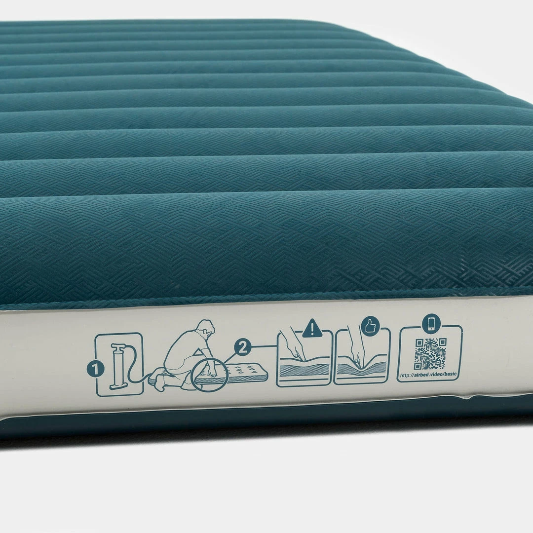 The ideal inflation for this kind of mattress is generally moderate (0.02 bar or 0.3 PSI), which, when you are sitting on the mattress, allows you to feel the ground under you. Once you lie down, the mattress will fit around your body and therefore provide the best comfort. We recommend using a pump type: Quechua 5.2 L red (8243066), which is our most efficient and leading model.