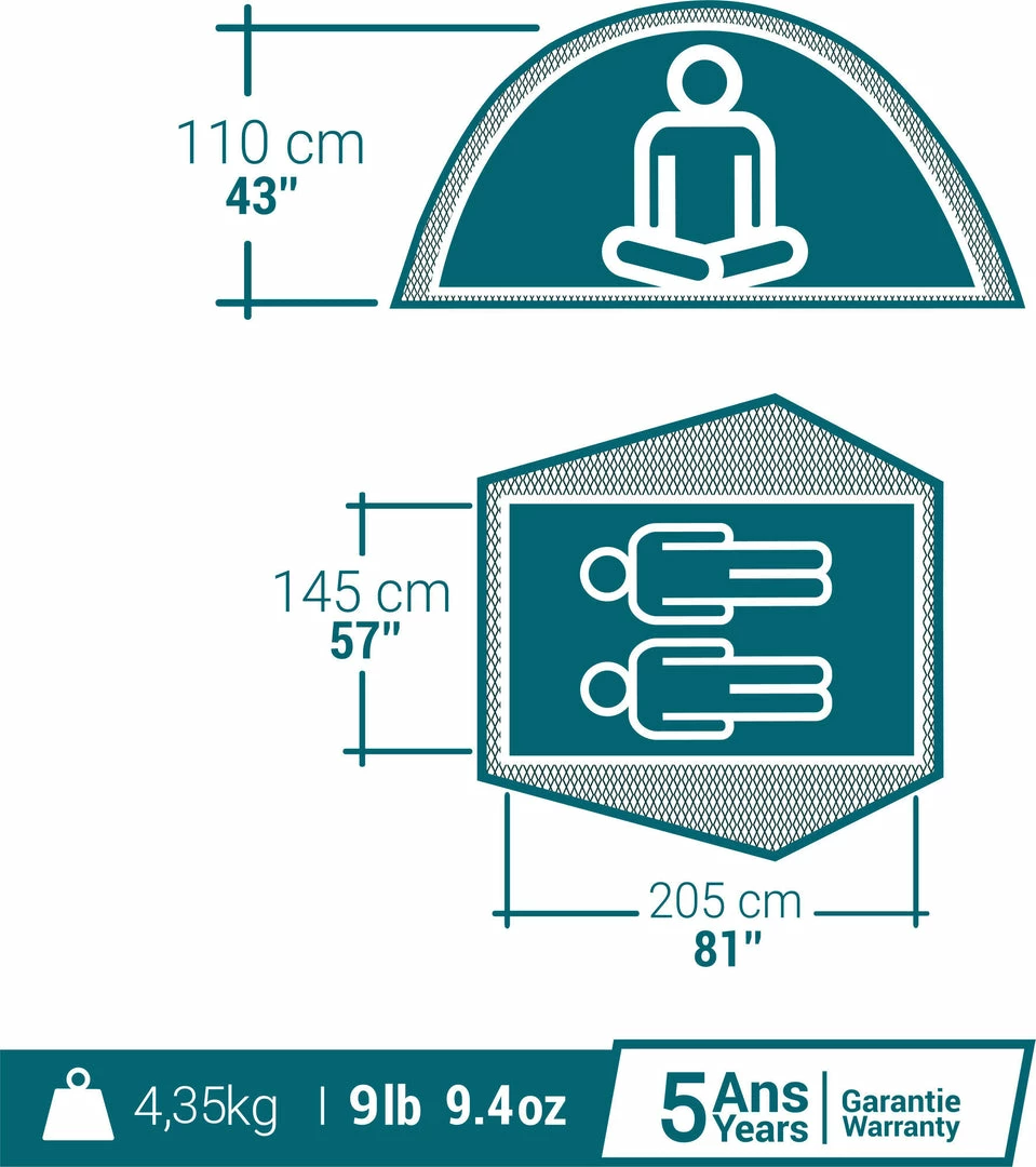 5 years. REPAIRS: All our tents can be repaired in the workshop of your local Decathlon store.