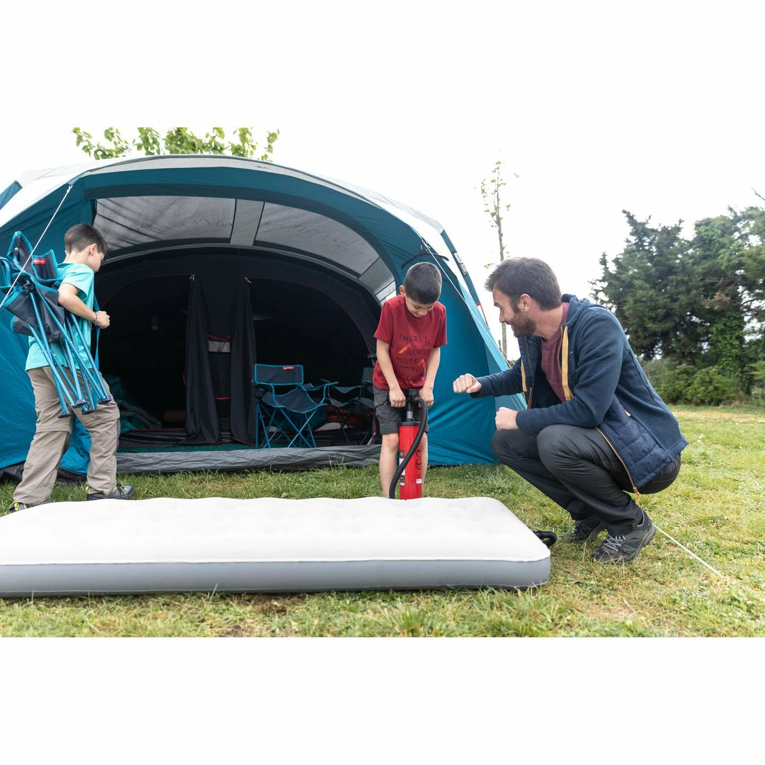 For your comfort and to preserve the life of your mattress, it is important not to over-inflate. When sitting on your inflated mattress, you should feel the floor close to your buttocks. Once you are lying down, the air pressure will be distributed under your entire body and will provide you with optimal comfort. You can use an integrated manometer pump, like our Quechua 5.2 L: the recommended pressure level is about 0.3 to 0.5 PSI.