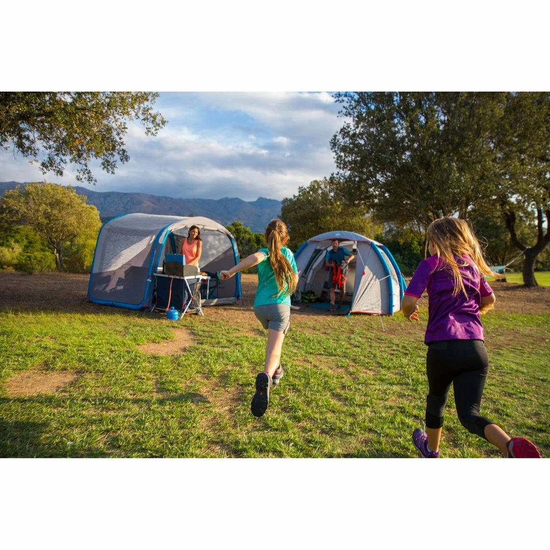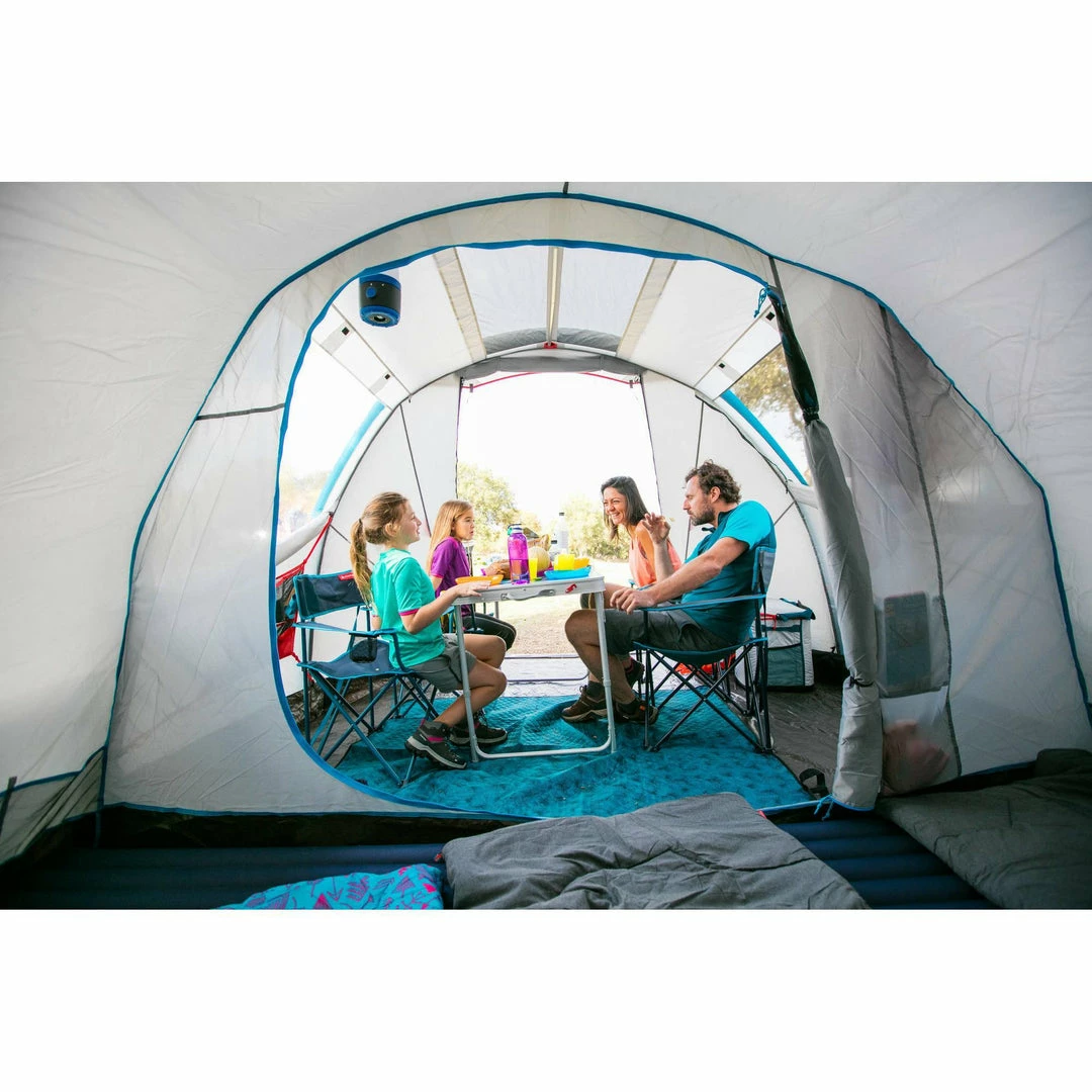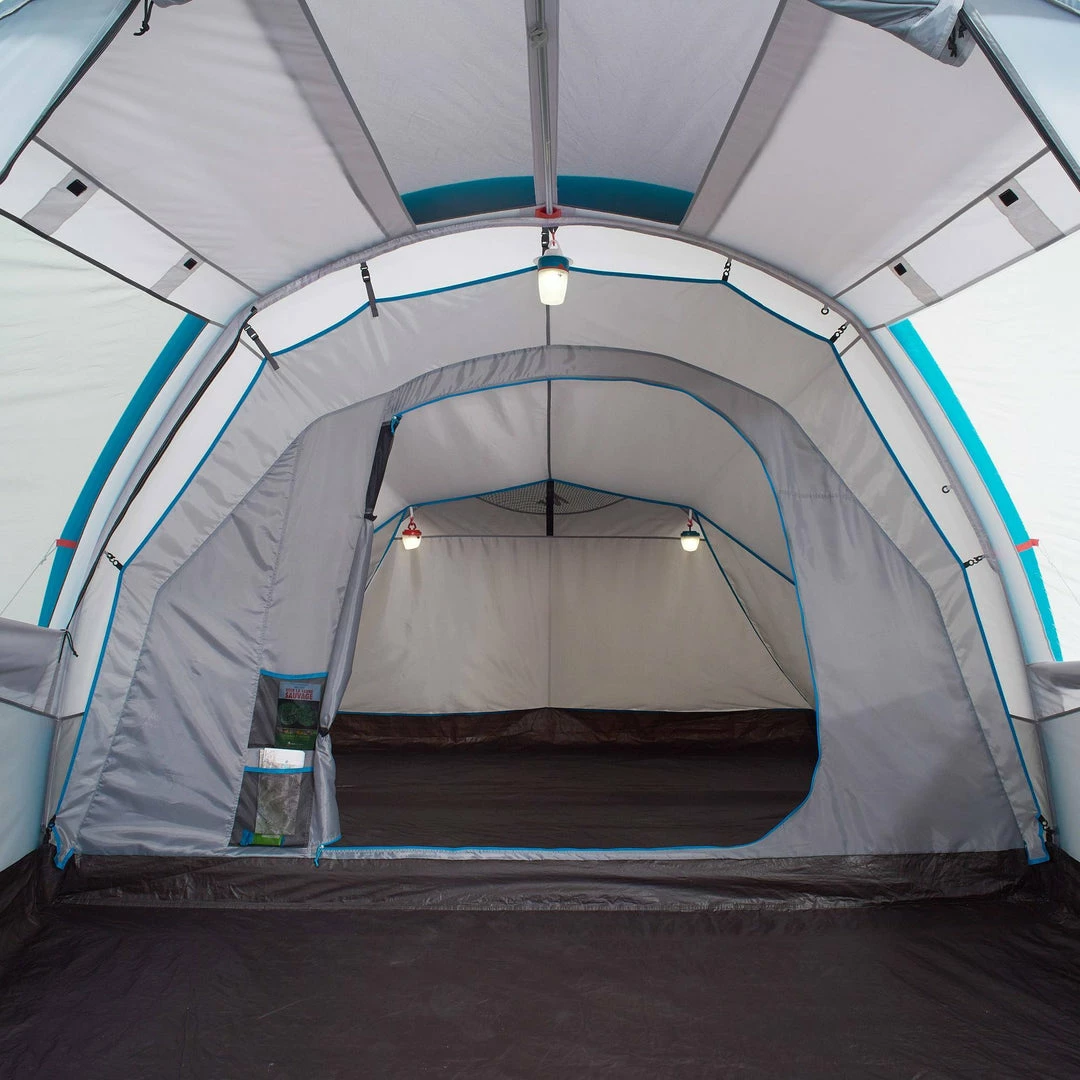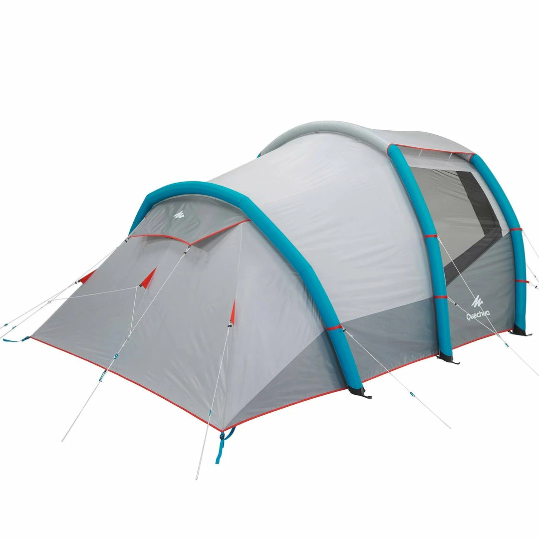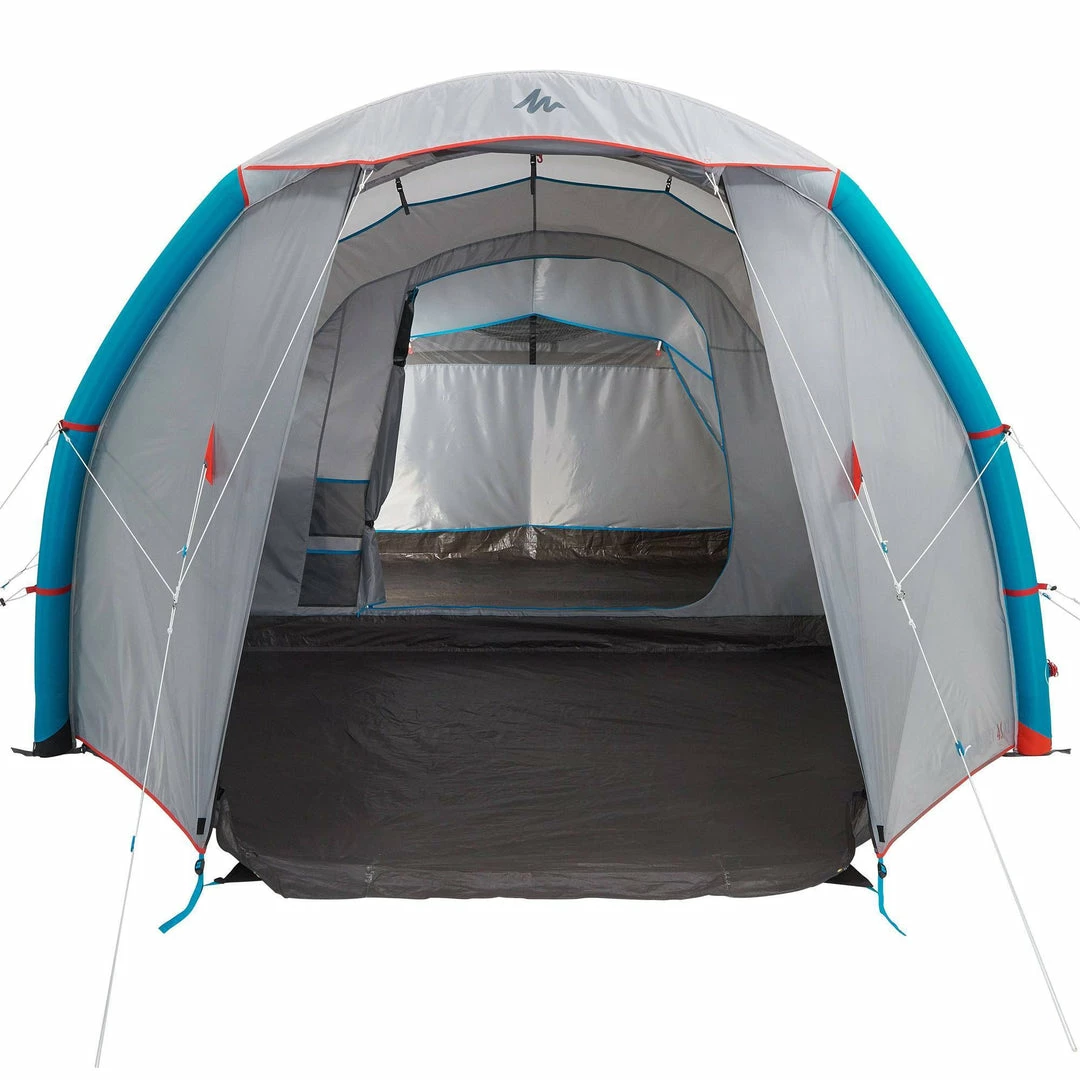 Inflatable all-in-1 structure with pre-assembled bedroom and fly sheet.
