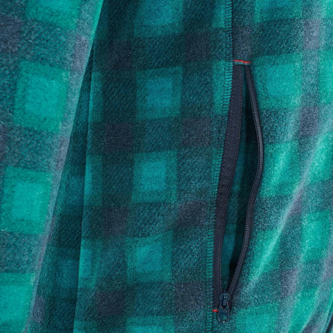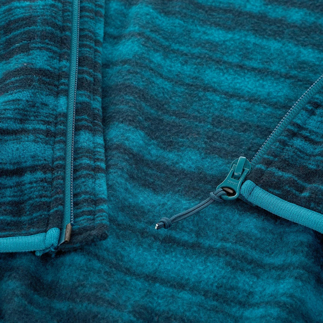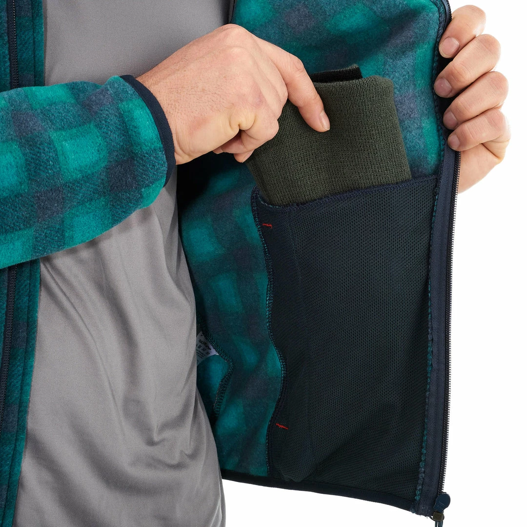The fleece component is designed to trap the air thanks to the volume created by its texture; this air acts as a natural insulator, keeping the body warm. The brushing of the knit fabric traps the air.