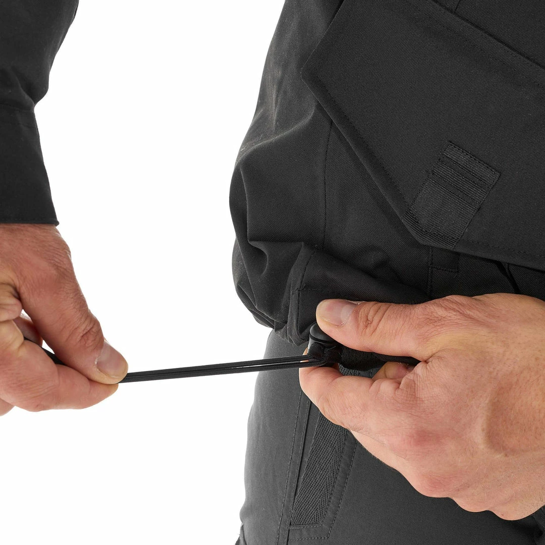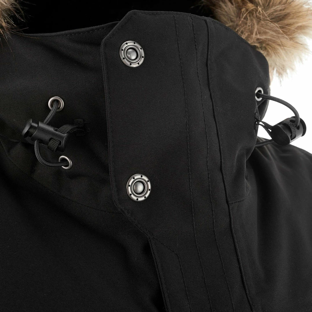 Lined with polyester wadded filling and fitted with a removable synthetic fur edge. Height is adjustable using an elastic drawcord and toggles. Depth is adjustable using a rip-tab positioned at the rear of the hood.