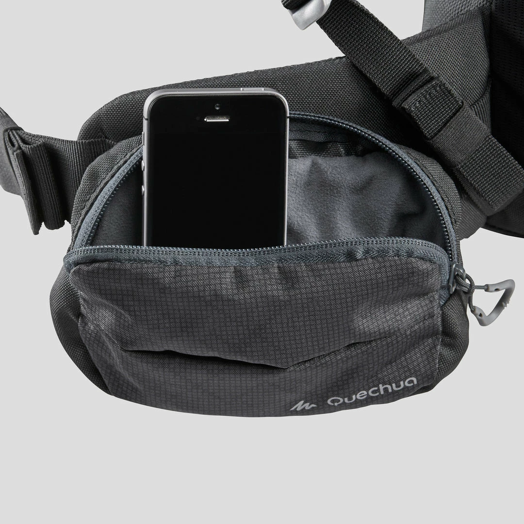 A ventilated back, comfortable carrying with a belt. A 3-liter top pocket, a smartphone pocket on the front of the belt, a secret pocket inside the bag.
