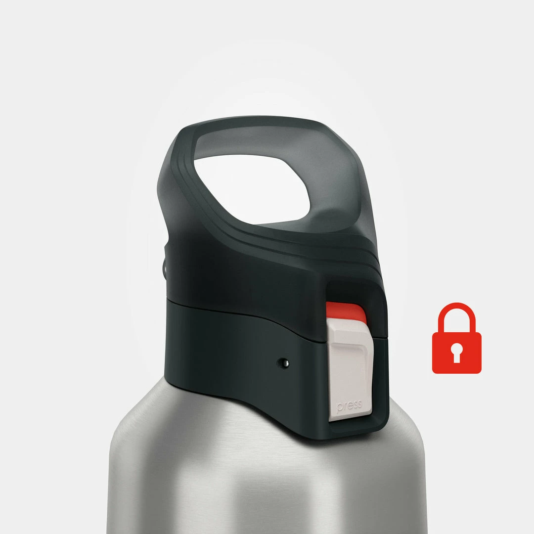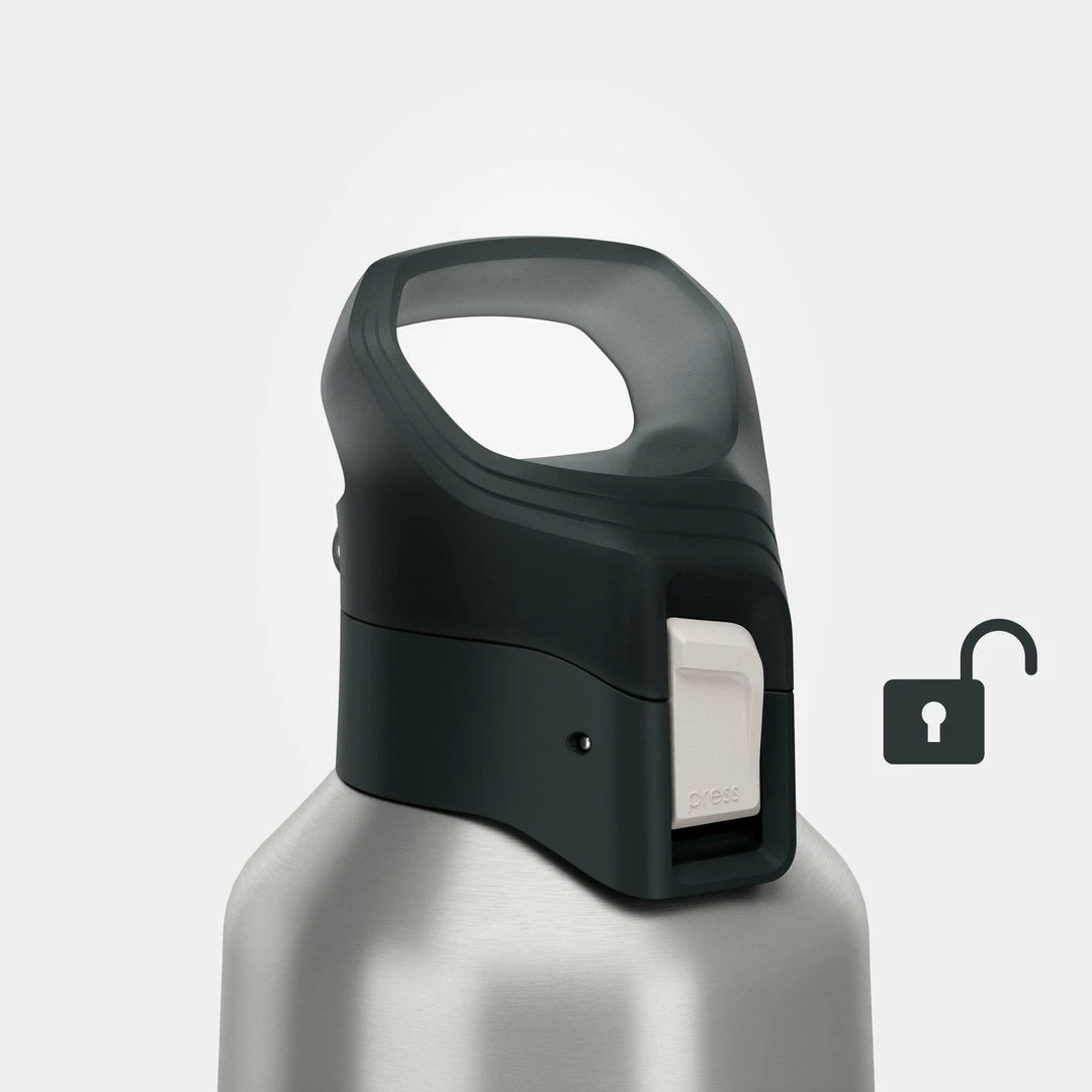 The top is easy to open with one hand by pressing on the white button marked “PRESS.” When carrying the flask, you can lock this button by sliding the white button down. A red area appears, indicating that the top is locked and it can no longer be pressed.