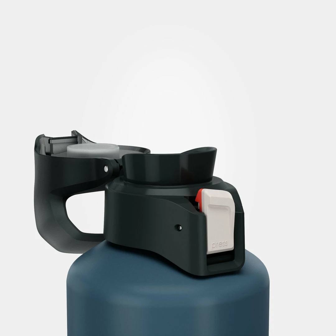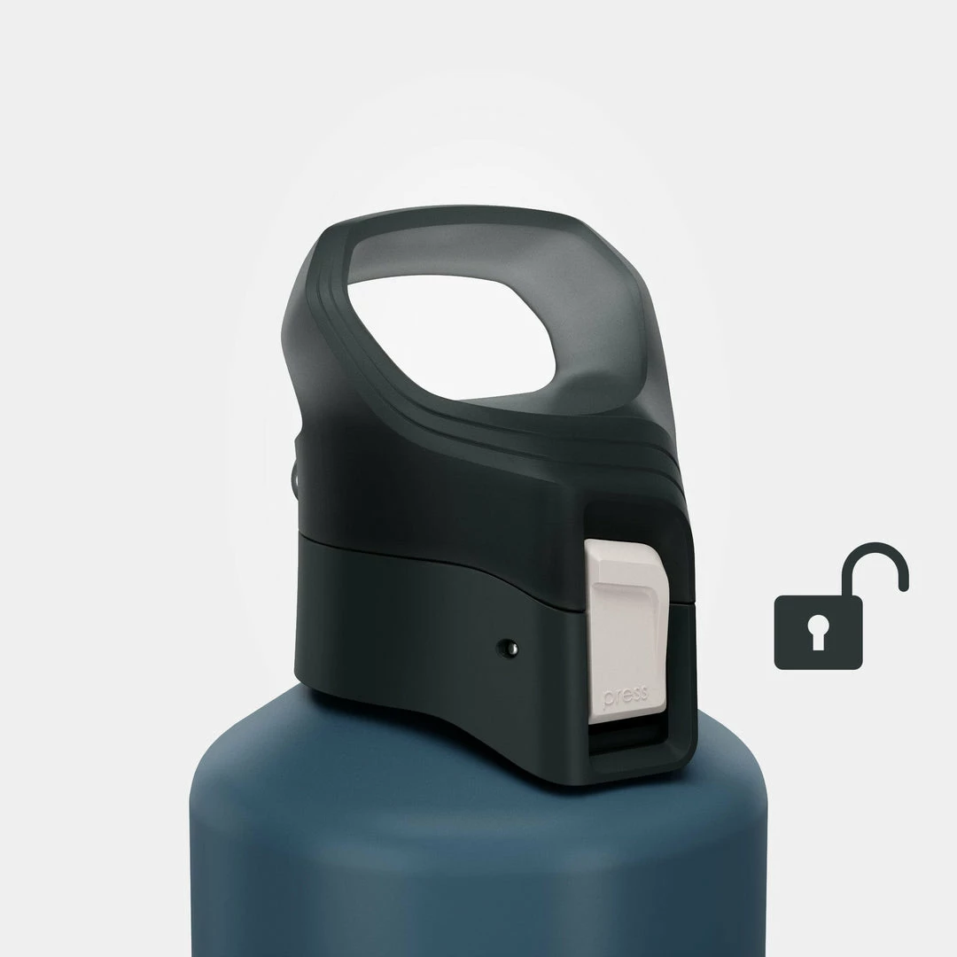 The top is easy to open with 1 hand by pressing on the white button marked “PRESS.” When carrying the water bottle, you can lock this button by sliding the white button down. A red area appears, indicating that the top is locked and it can no longer be pressed. It also has a filter so you can infuse your water with fruit, for example, and a built-in resistant carry handle.