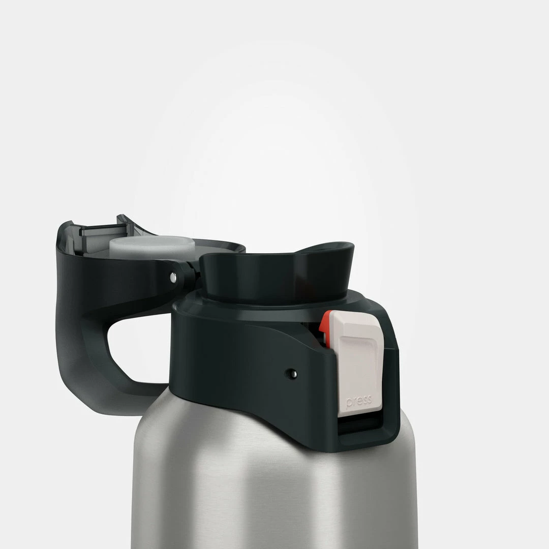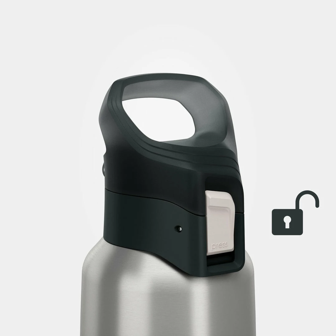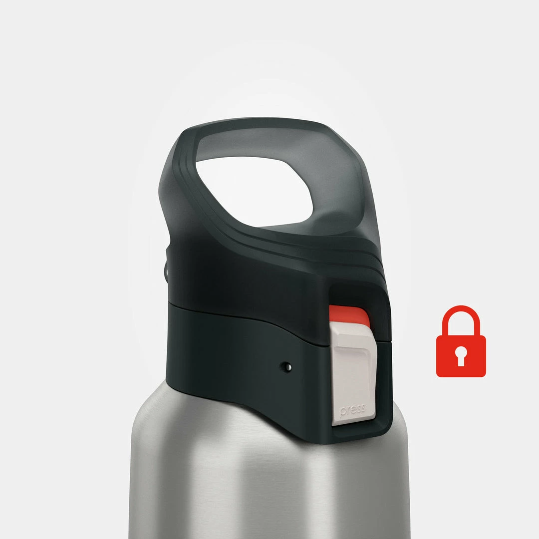The top is easy to open with one hand by pressing on the white button marked “PRESS.” When carrying the flask, you can lock this button by sliding the white button down. A red area appears, indicating that the top is locked and it can no longer be pressed.