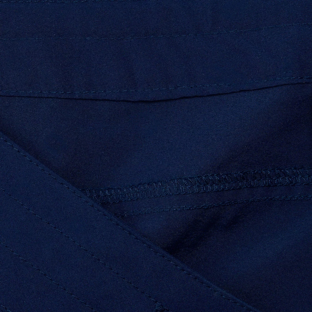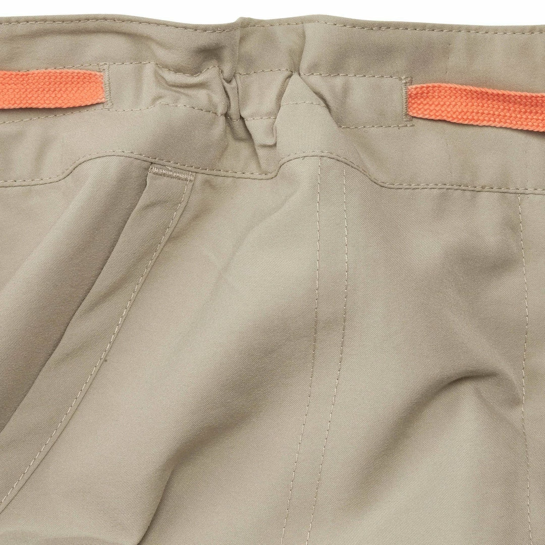 Straight cut. Mid-thigh length. Waistband with snap fastener and drawstring.
